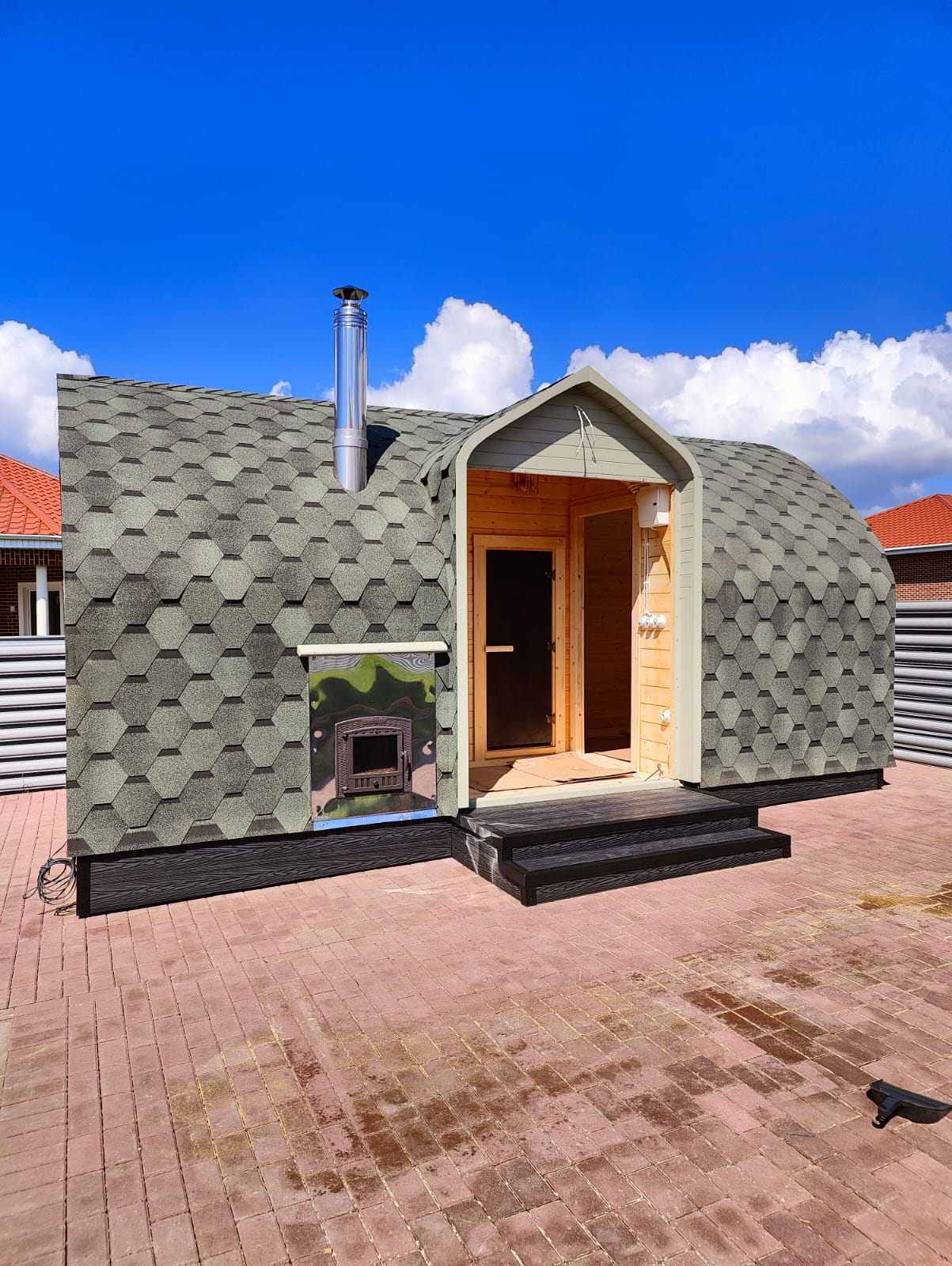 6. В парной монтируется дровяная печь: «Везувий» с выносной топкой (на улицу) и комплектом камней.